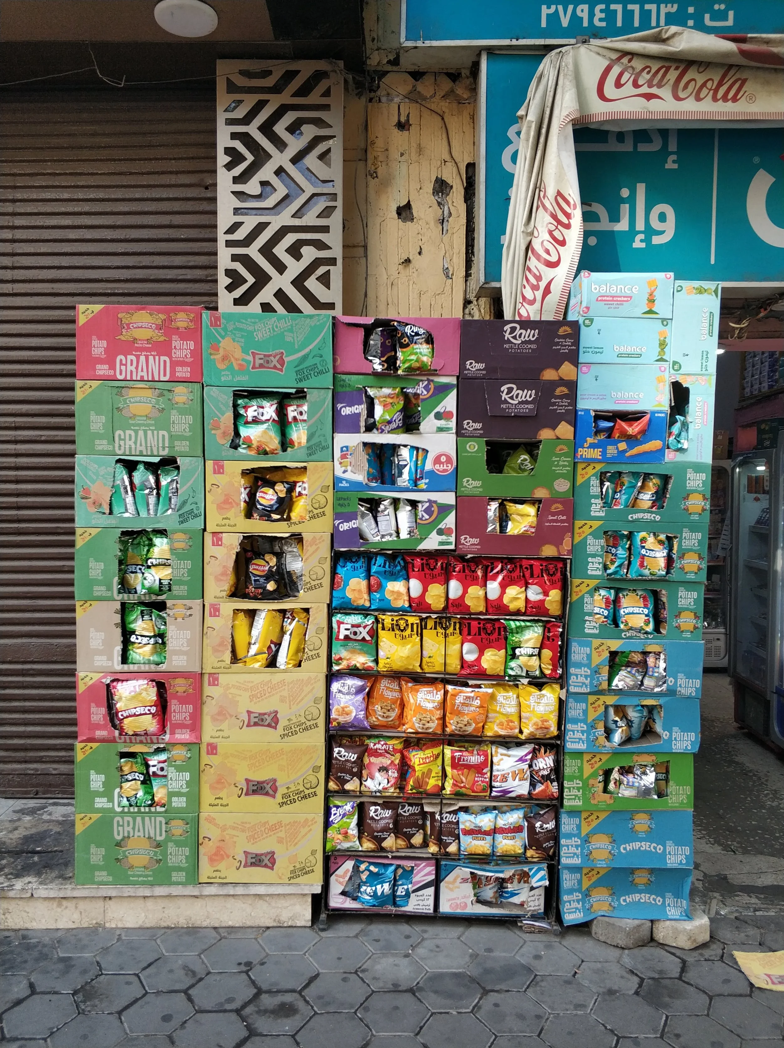 An Egyptian innovation in mini market product displays - cuts out the need for purchasing additional shelving and also acts as its own colourful marketing tool. Simple and effective (for delivering empty, overpriced calories of fake food to the masses).